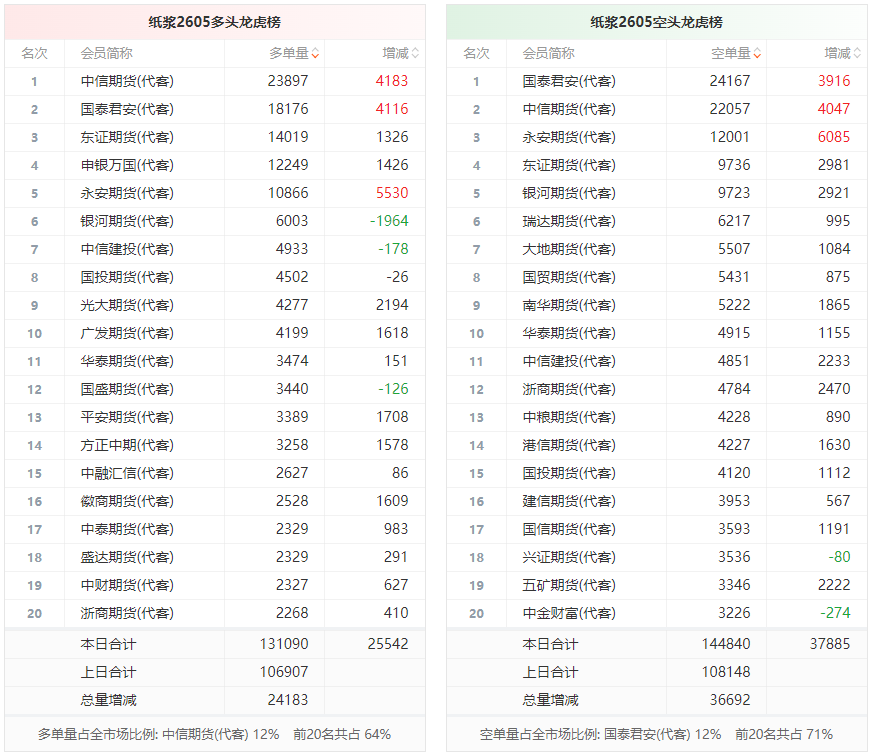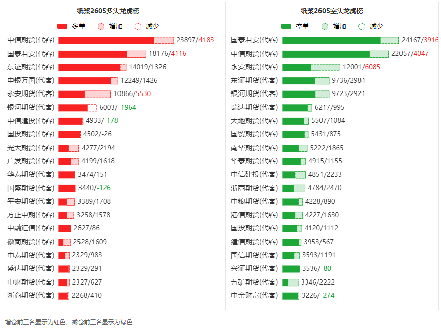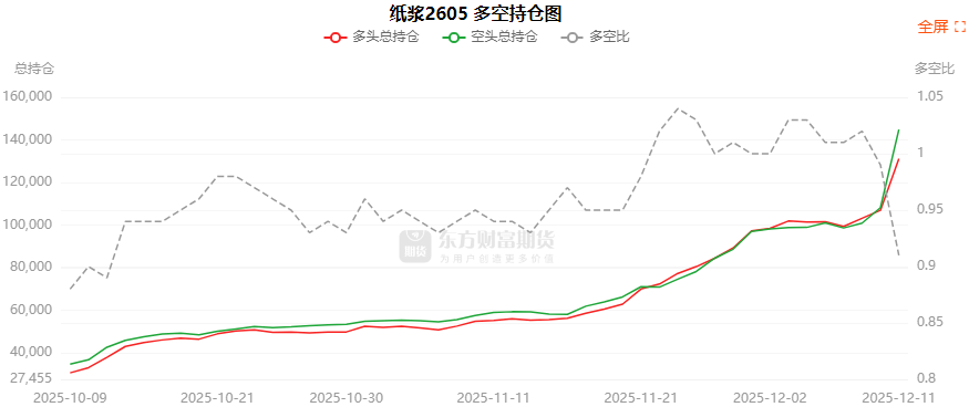 总体而言,纸浆2605合约今日增仓上行,多空持仓排名前20席中,多空双方均呈进场态势,多头进场意愿弱于空头。