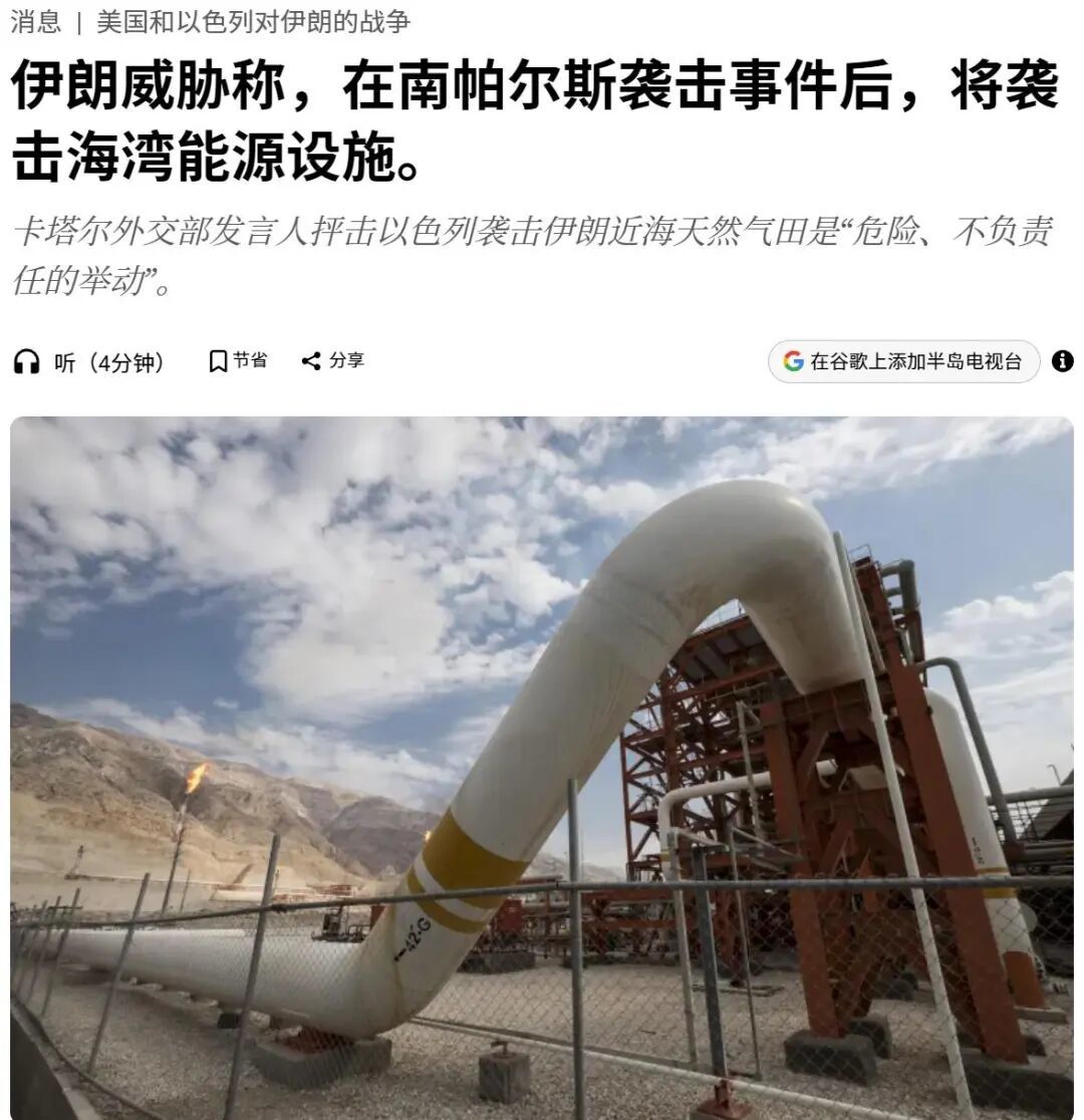 随后伊朗的最大气田——南帕尔斯气田也被炸了。伊朗随即宣布,把沙特、阿联酋、卡塔尔三国一大批油气田、石化工厂列入打击清单。
