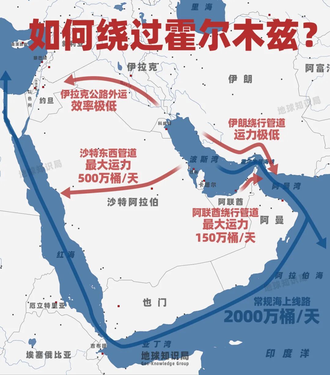 沙特有东西石油管道,能走红海出口,最大运力大约500万桶/天;阿联酋有通往富查伊拉港的管道,能绕开霍尔木兹海峡,大约150万桶/天。