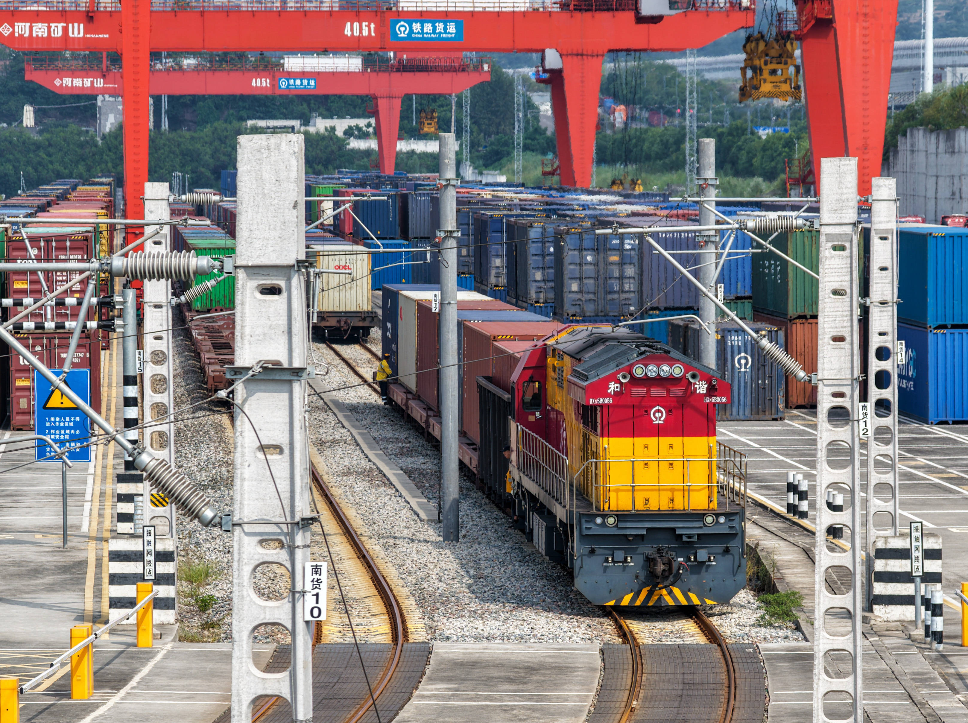 9月28日智股策略,西部陆海新通道班列在重庆鱼嘴站等待发车(无人机照片)。新华社记者 唐奕 摄